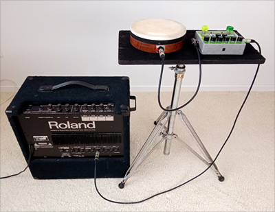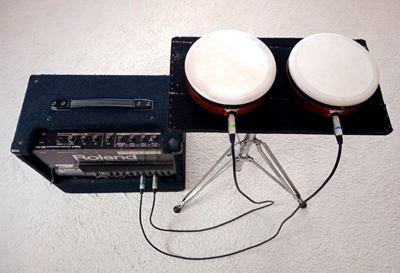 The small Congapad is connected to a drum module or drum synthesizer with a trigger input. The sound is selected on the module or synthesizer.